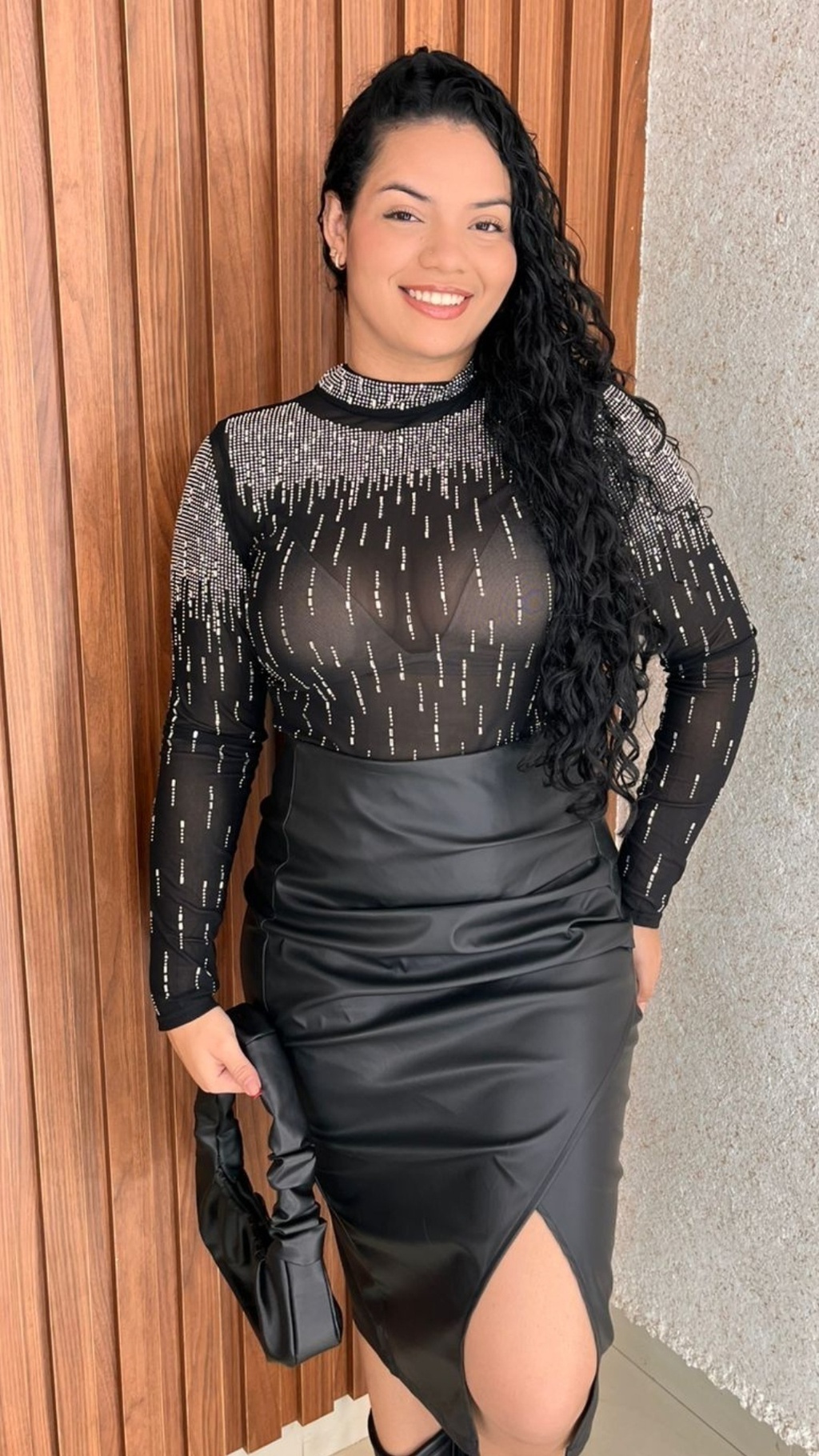 A blusa da imagem é uma peça extremamente elegante e impactante, ideal para produções noturnas e sofisticadas. Ela é confeccionada em tule preto transparente, que proporciona um efeito sensual e moderno ao look. A modelagem é ajustada ao corpo, com mangas longas e gola alta, criando um visual equilibrado entre ousadia e sofisticação.