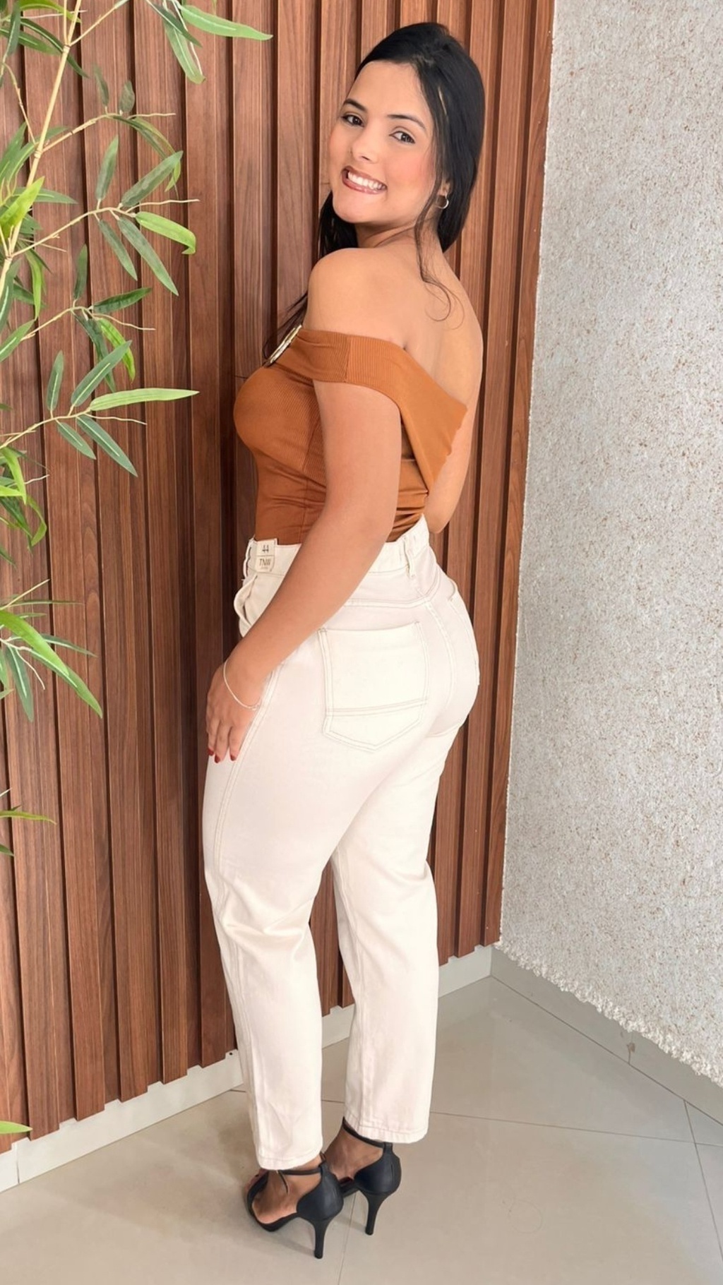 A barra é reta, sem detalhes como dobraduras ou desfiados, reforçando a estética minimalista e refinada da peça. Essa calça é perfeita tanto para ocasiões casuais quanto para eventos mais arrumados, dependendo dos complementos utilizados, como no caso da imagem em que foi combinada com um top moderno e sandálias de salto fino.