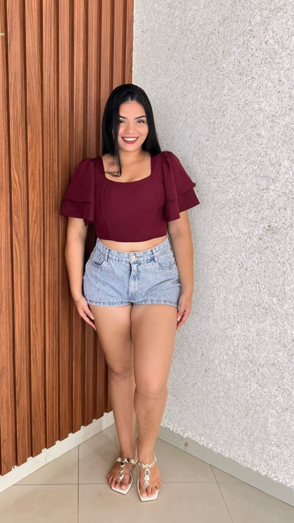 O modelo é cropped, ou seja, mais curto, terminando logo acima da cintura e deixando parte do abdômen à mostra.