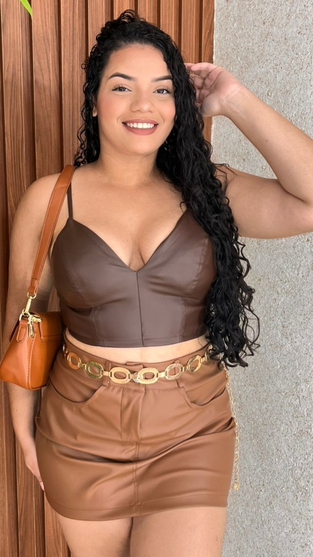 O top tem um tom de marrom escuro chocolate, que transmite sofisticação, seriedade e combina perfeitamente com tons terrosos ou dourados, como na composição da imagem.