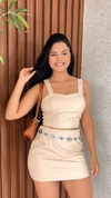 O cropped da imagem é uma peça bastante elegante e moderna, com um design que valoriza a silhueta de forma sofisticada. Ele é confeccionado em um tecido de tom bege claro, liso e levemente acetinado, o que contribui para um visual clean, mas ao mesmo tempo refinado.