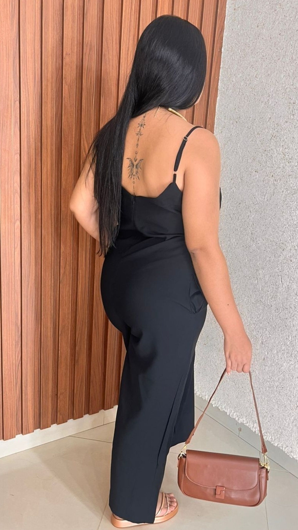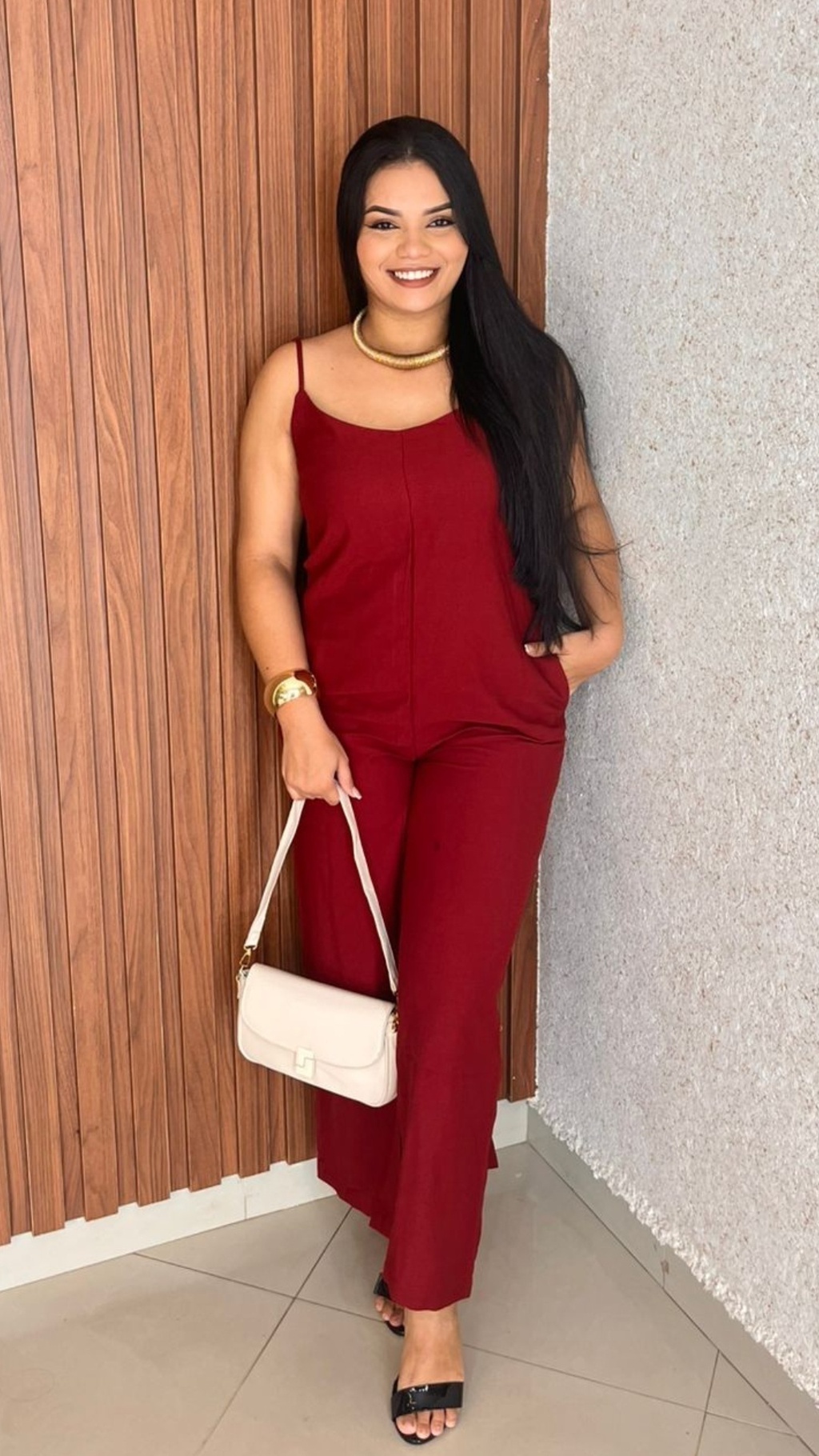 O macacão da imagem é uma peça elegante e moderna, confeccionada em um tecido leve e de caimento fluido, com acabamento fosco,que transmite sofisticação.O modelo é de alças finas e decote reto, o que valoriza a região do colo com sutileza e equilíbrio, sem exageros. O corte é reto e solto ao longo das pernas, proporcionando conforto e um visual alongado, além de favorecer diversos tipos de corpo. A peça conta com bolsos laterais, que adicionam praticidade e um toque descontraído à composição.