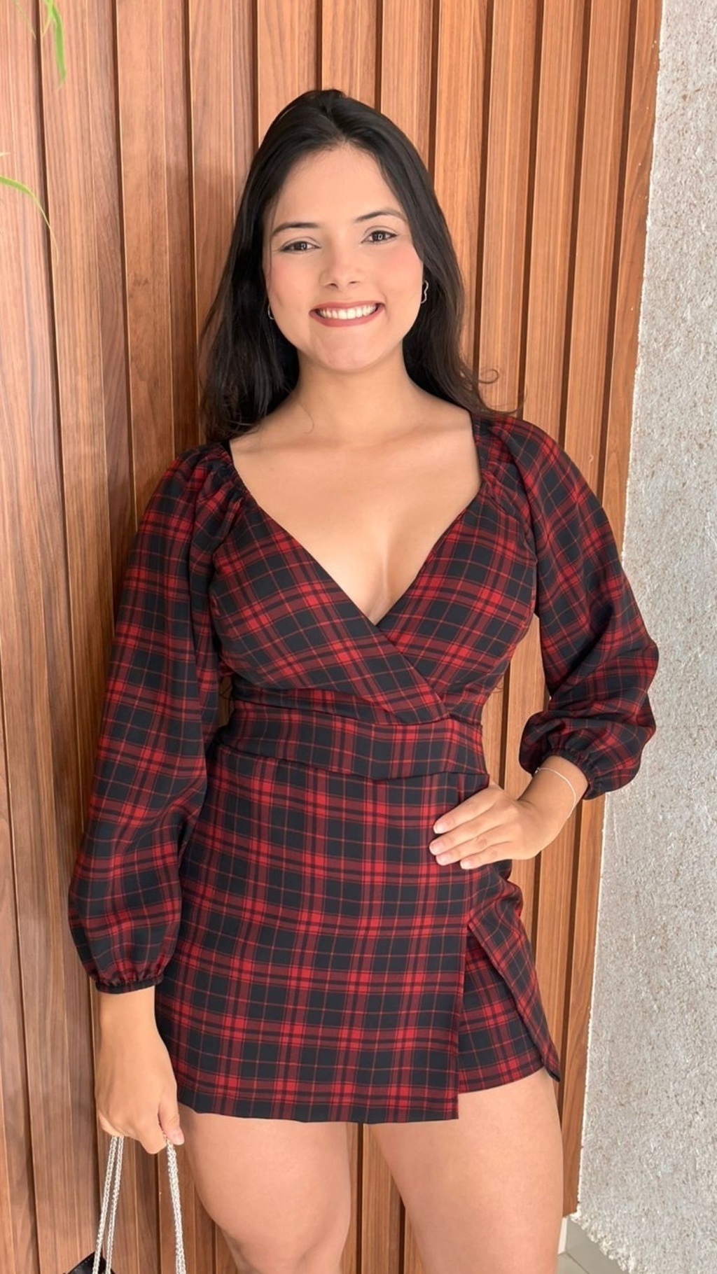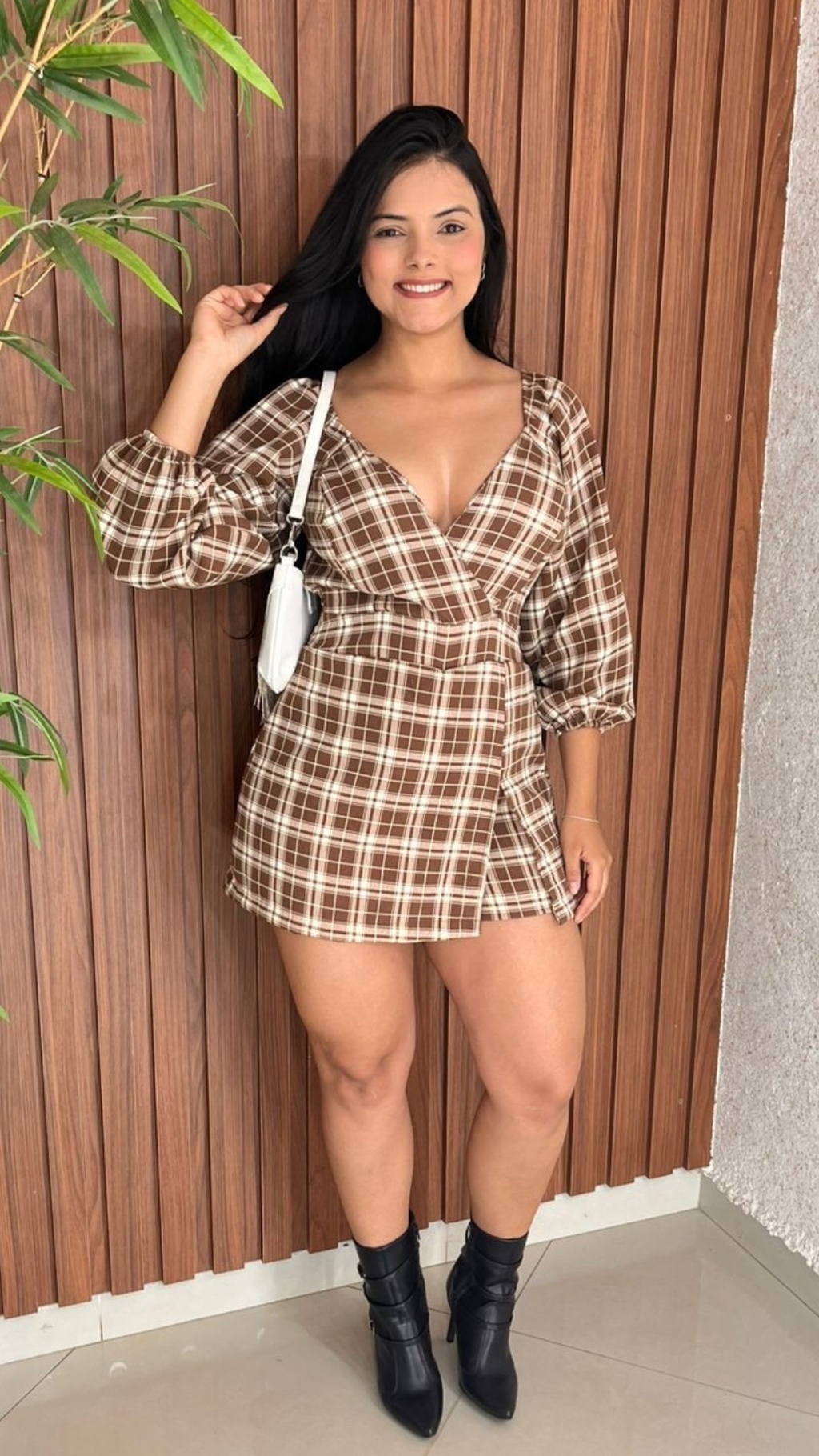 Confeccionado em tecido com estampa xadrez, o visual traz uma estética retrô e rústica, inspirada no estilo country, mas com uma modelagem atualizada e sensual. O decote em V profundo transpassado valoriza o colo e confere feminilidade à peça. As mangas longas bufantes com elástico nos punhos criam volume nos ombros e equilíbrio na silhueta, remetendo a um estilo romântico e elegante.