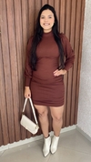 O vestido da imagem é um modelo curto, ajustado ao corpo, com um estilo elegante e versátil. Confeccionado em tecido canelado de tonalidade marrom terroso, ele combina conforto e sofisticação, ideal para dias mais frescos ou produções de meia-estação.