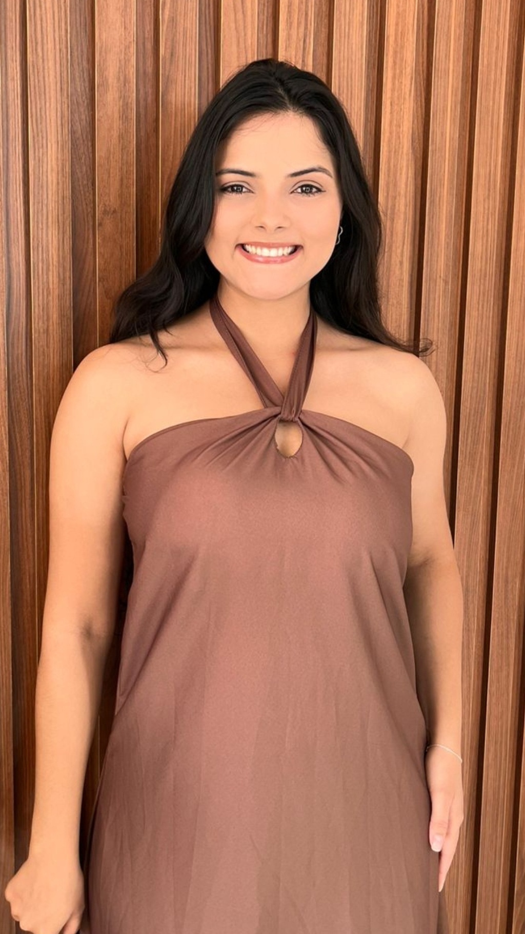 O vestido da imagem é um modelo longo elegante e cheio de personalidade, ideal para quem busca um visual moderno com um toque de sofisticação natural. Ele é confeccionado em tecido leve com ótimo caimento, na cor marrom terroso — uma tonalidade quente e versátil que transmite aconchego e estilo.